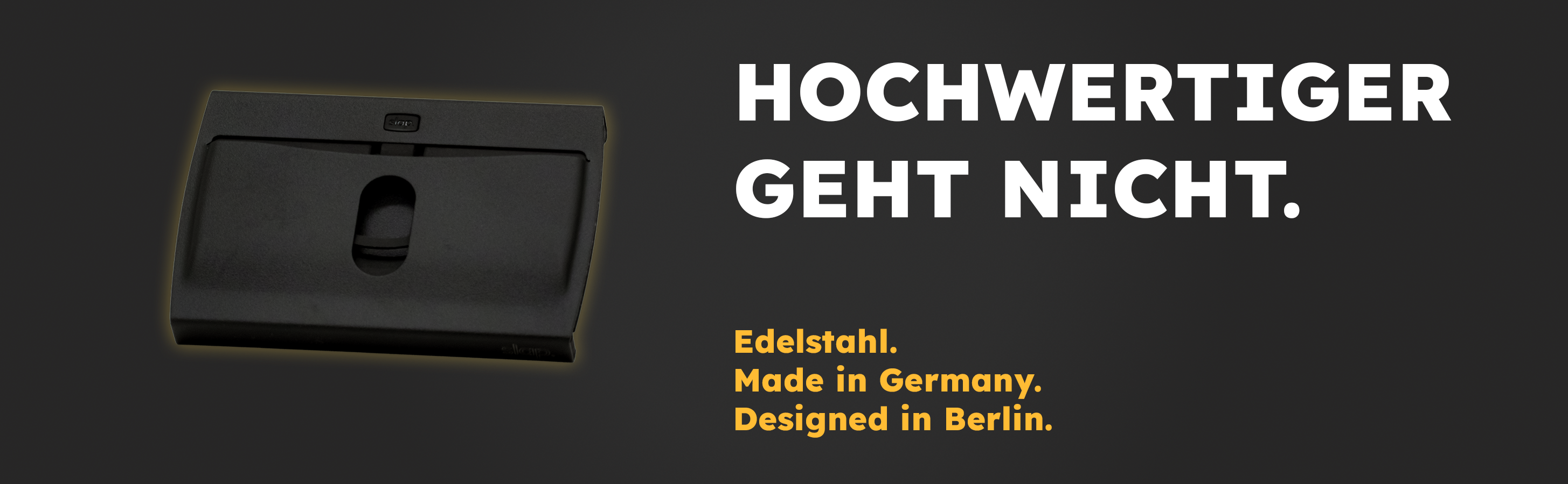 Minimalistisches Edelstahl-Wallet mit innovativem Easy-Scroll-System. Zahle einhändig innerhalb von Sekunden. Hält bis zu 7 Karten und 4 Geldscheine.